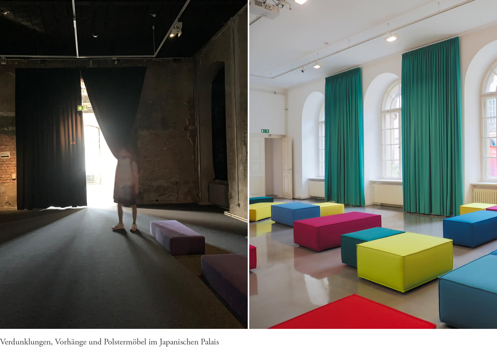 Unsere Aufgaben im Japanischen Palais waren äußerst vielseitig: Sie reichten von klassischen Verdunklungsvorhängen und Raumteilern über bemalbare Folienvorhänge und Sonnenschutz bis hin zu Teppichböden und verschiedenen Polsterarbeiten im gesamten Objekt.
